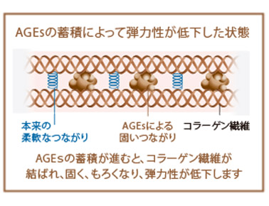 ※2 美容でよく耳にする“コラーゲン”はたんぱく質からできています。そのため、コラーゲンでAGEsの蓄積がおこると、コラーゲン繊維どうしが結ばれ、固くなり柔軟性が低下します。主にコラーゲンによって出来ている肌、血管、骨は弾力性がなくなり、シワやハリの原因となります。